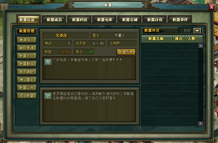 加入联盟需要鸿胪寺1级,每人同时只能申请加入3个联盟,最终只能加入一个联盟。